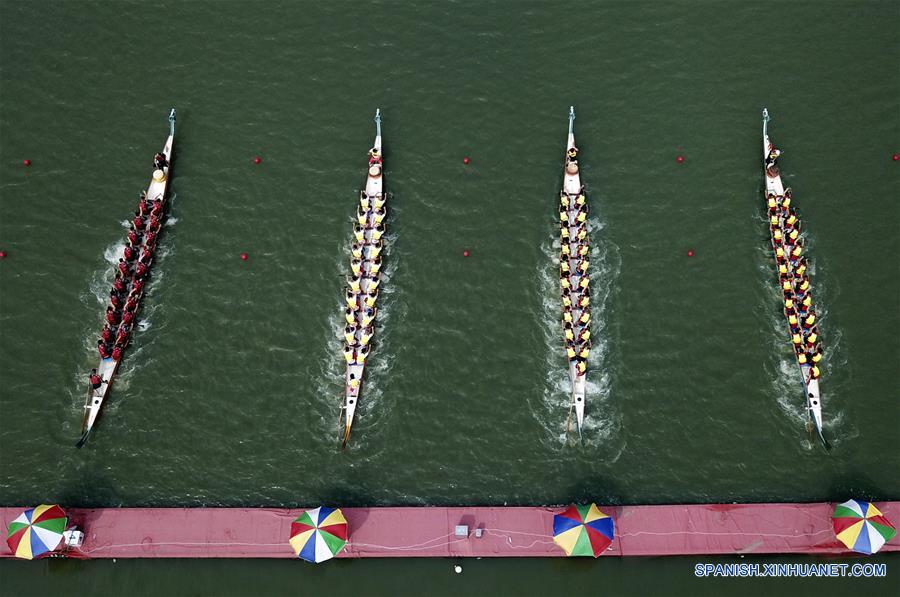 Competidores participan en una competencia de botes del dragón llevada a cabo en un parque acuático del lago Huichang, en Wenzhou, provincia de Zhejiang, en el este de China, el 26 de mayo de 2018. (Xinhua/Su Qiaojiang)