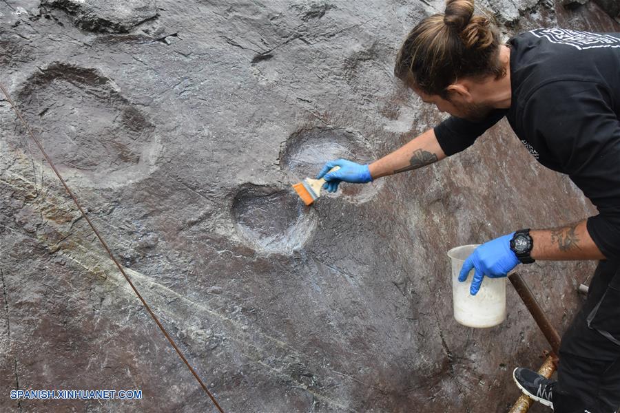 BEIJING, 26 may (Xinhua) -- Expertos procedentes de China y Grecia han iniciado recientemente su primer trabajo de conservación conjunta en más de 170 huellas de dinosaurio fosilizadas descubiertas en un suburbio de Beijing.