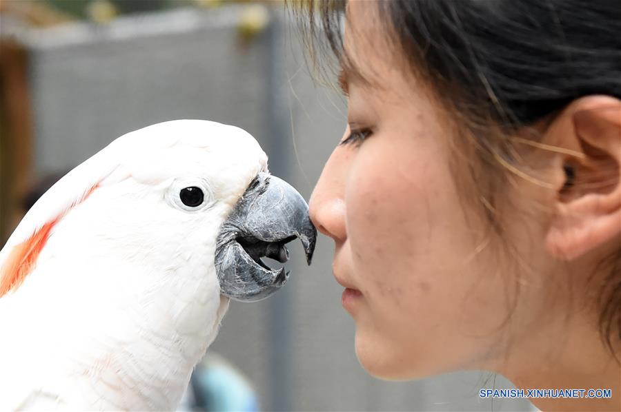 CHONGQING, mayo 27, 2018 (Xinhua) -- Una visitante interactúa con un perico en un aviario dentro del Zoológico de Chongqing, en Chongqing, en el suroeste de China, el 27 de mayo de 2018. El aviario, con más de 600 pericos de al menos 30 especies distintas, fue inaugurado el domingo, ofreciendo a los visitantes una experiencia interactiva. (Xinhua/Tang Yi)