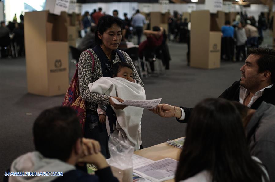 BOGOTA, mayo 27, 2018 (Xinhua) -- Una mujer recibe un tarjetón para emitir su voto en el centro más grande de votación Corferias, en Bogotá, Colombia, el 27 de mayo de 2018. El candidato del partido Centro Democrático, Iván Duque, y el del movimiento Colombia Humana, Gustavo Petro, disputarán la segunda vuelta de elecciones presidenciales en Colombia, según informes de la Registraduría Nacional del Estado Civil. Con el 99,46 por ciento de las mesas informadas, Duque obtiene 7.539.930 votos, o el 39,11 por ciento, mientras que Petro recibe 4.838.639 votos, o el 25,10 por ciento.(Xinhua/Jhon Paz)
