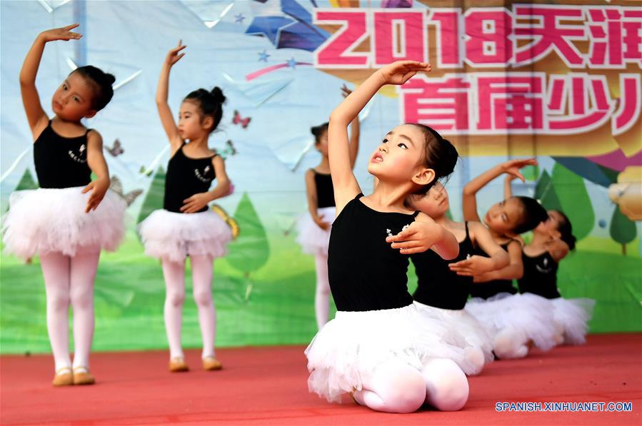 GUANGXI, mayo 28, 2018 (Xinhua) -- Imagen del 27 de mayo de 2018 de ni?as realizando una danza en una base de entrenamiento artístico para celebrar el Día del Ni?o, en el distrito de Qinbei, en la ciudad de Qinzhou, en la Región Autónoma Zhuang de Guangxi, en el sur de China. (Xinhua/Zhang Ailin)
