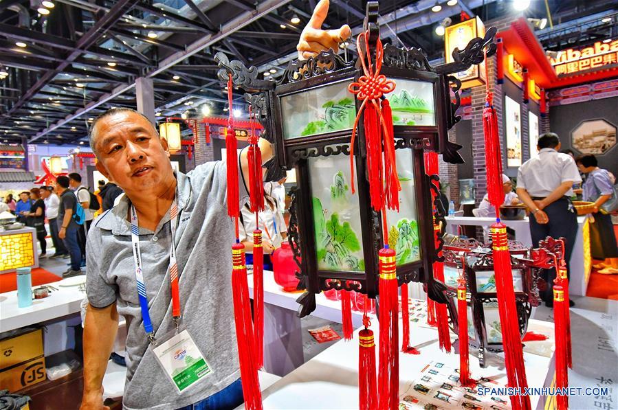Un expositor exhibe una linterna tradicional en la 5 Feria Internacional de Comercio de Servicios de Beijing de China, en Beijing, capital de China, el 28 de mayo de 2018. La feria inició el lunes y cerrará el 1 de junio. Más de 130 seminarios, reuniones y actividades de comercio han sido planeadas para la feria. (Xinhua/Li Xin)