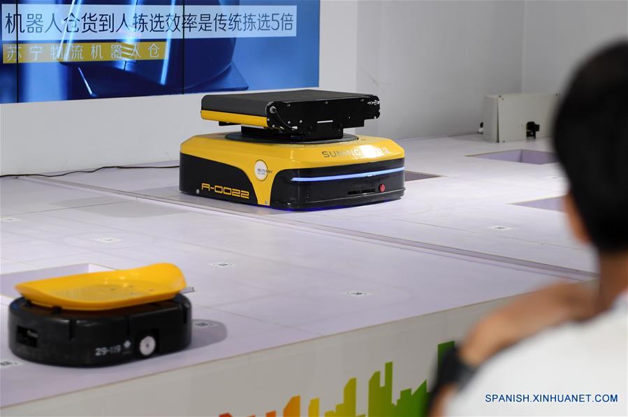 BEIJING, mayo 28, 2018 (Xinhua) -- Un visitante observa robots logísticos en la 5 Feria Internacional de Comercio de Servicios de Beijing de China, en Beijing, capital de China, el 28 de mayo de 2018. La feria inició el lunes y cerrará el 1 de junio. Más de 130 seminarios, reuniones y actividades de comercio han sido planeadas para la feria. (Xinhua/Zhang Chenlin)