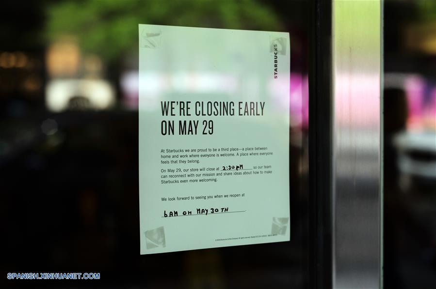 NUEVA YORK, mayo 29, 2018 (Xinhua) -- Vista de un letrero permaneciendo en la puerta de una tienda Starbucks cerrada, en Manhattan, Nueva York, Estados Unidos, el 29 de mayo de 2018. De acuerdo con información de la prensa local, Starbucks cerró el martes por la tarde en Estados Unidos alrededor de 8,000 tiendas de la compa?ía para ofrecerle a cerca de 175,000 empleados un entrenamiento obligatorio en contra de los prejuicios raciales. (Xinhua/Li Muzi)