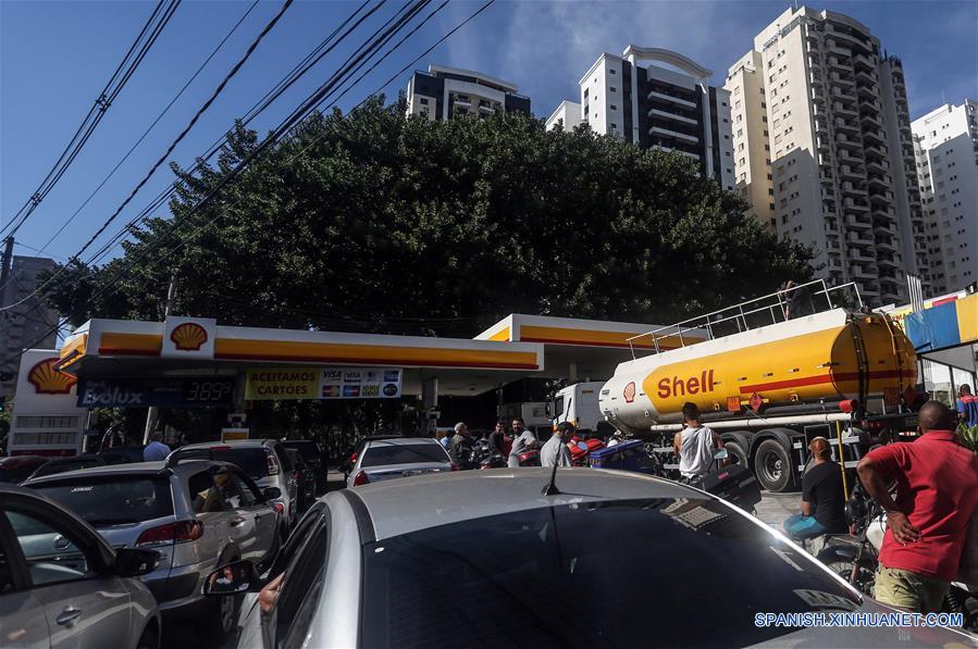 Conductores esperan en largas filas para repostar en Sao Paulo, Brasil, el 29 de mayo de 2018. Los establecimientos de combustible en Brasil comenzaron a ser abastecidos la ma?ana del martes, luego de las medidas del gobierno para poner fin a la paralización de los camioneros, aunque las protestas continuaban en al menos 20 estados y el Distrito Federal. Entre las consecuencias más preocupantes están las dificultades para asegurar el envío de material esencial a centros de salud, al tiempo que el abastecimiento de alimentos en las ciudades aún ocurre en forma irregular. (Xinhua/Rahel Patrasso)