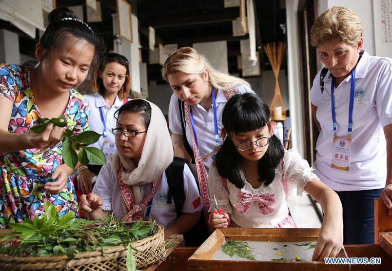 Unas artesanas extranjeras aprenden las técnicas de producción del papel Huacao, una especie de papel tradicional chino hecho a mano, en la aldea Wanda del condado Danzhai en la prefectura autónoma Miao y Dong de Qiandongnan, provincia de Guizhou, suroeste de China, el 15 de agosto de 2017. La XVII Cumbre de la Organización de Cooperación de Shanghai (OCS) está programada del 9 al 10 de junio en Qingdao, una ciudad costera de la provincia de Shandong, este de China. Desde que China asumió la presidencia rotatoria de la OCS en junio pasado, hasta la fecha se han llevado a cabo más de 160 actividades, incluyendo una serie de importantes reuniones institucionales y eventos multilaterales. (Xinhua / Ju Zhenhua)