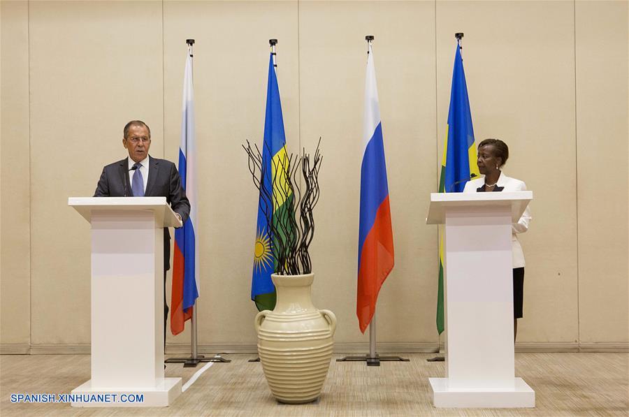 KIGALI, junio 3, 2018 (Xinhua) -- El ministro de Relaciones Exteriores de Rusia, Sergey Lavrov (i) y su homóloga de Rwanda, Louise Mushikiwabo (d) asisten a una conferencia de prensa, en Kigali, Rwanda, el 3 de junio de 2018. El ministro de Relaciones Exteriores de Rusia, Sergey Lavrov, llegó el domingo por la ma?ana a la capital ruandesa Kigali para realizar una visita oficial de un día con el fin de reforzar la relación bilateral. (Xinhua/Gabriel Dusabe)