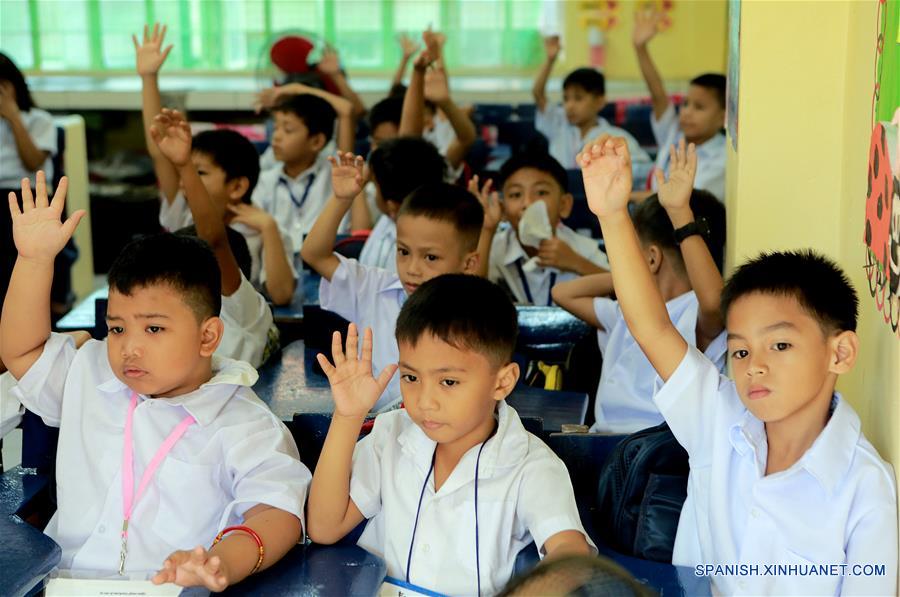 Estudiantes asisten a una clase durante el primer día de clases, en la Escuela Primaria Presidente Corazon C. Aquino, en la ciudad de Quezón, Filipinas, el 4 de junio de 2018. (Xinhua/Rouelle Umali)