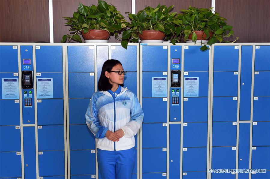Imagen del 3 de junio de 2018 de una voluntaria vigilando los casilleros en el centro de medios de la Cumbre de la Organización de Cooperación de Shanghai (OCS), en Qingdao, en la provincia de Shandong, en el este de China. El centro de medios abrirá el 6 de junio, de acuerdo a su agenda. Un total de 370 voluntarios de cuatro universidades en Qingdao han permanecido en sus puestos después de tres meses de entrenamiento. (Xinhua/Li Ziheng)