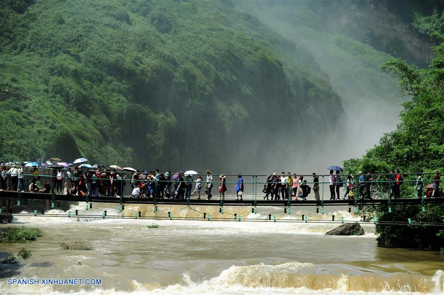 GUIZHOU, junio 5, 2018 (Xinhua) -- Turistas visitan la Cascada Huangguoshu, en la ciudad de Anshun, provincia de Guizhou, en el suroeste de China, el 5 de junio de 2018. La cascada entró en el periodo de alto flujo debido a la continua caída de lluvia. (Xinhua/Yang Wenbin)