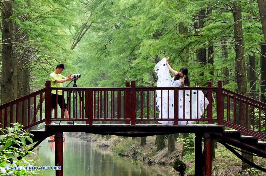 JIANGSU, junio 5, 2018 (Xinhua) -- Turistas se toman fotografías en un parque forestal acuático, en el municipio de Lizhong de Xinghua, provincia de Jiangsu, en el este de China, el 5 de junio de 2018. (Xinhua/Meng Delong)