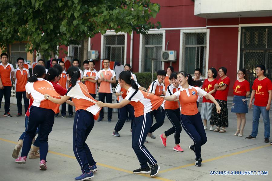 Estudiantes participan en juegos en la Escuela Secundaria No.14, en la ciudad de Hengshui, provincia de Hebei, en el norte de China, el 5 de junio de 2018. Varias actividades fueron llevadas a cabo para ayudar a los estudiantes a relajarse y estar mejor preparados para el próximo exámen nacional de entrada a la universidad. (Xinhua/Zhu Xudong)
