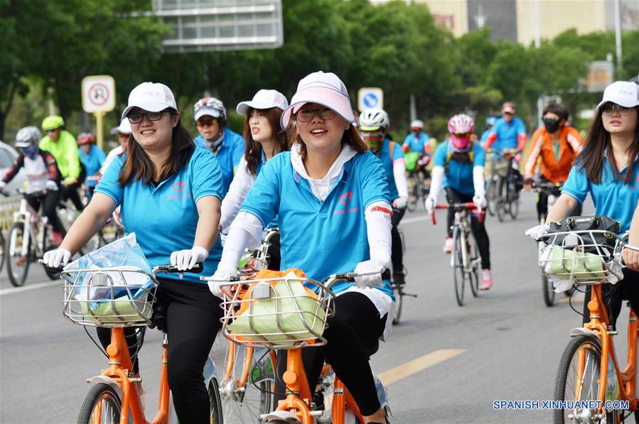 HOHHOT, junio 5, 2018 (Xinhua) -- Voluntarios transitan en bicicletas durante una actividad llevada a cabo para llamar la atención acerca de los viajes ecológicos, en Hohhot, capital de la Región Autónoma de Mongolia Interior, en el norte de Chhina, el 5 de junio de 2018. El Día Mundial del medio Ambiente se celebra el 5 de junio. (Xinhua/Zou Yu)