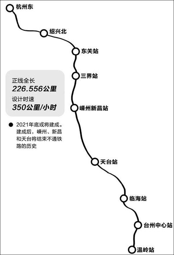 El ferrocarril, que tendrá una longitud de 226,56 kilómetros y está dise?ado para una velocidad máxima de 350 kilómetros por hora, es una ruta que enlaza las ciudades de Shaoxing y Taizho, de la misma provincia.
