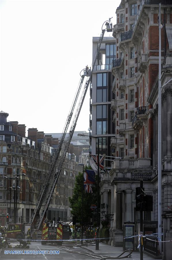 LONDRES, junio 6, 2018 (Xinhua) -- Bomberos y empleados de servicios de emergencias trabajan en la escena después de un incendio en el Mandarin Oriental Hotel, en Knightsbridge, Londres, Reino Unido, el 6 de junio de 2018. Un incendio de grandes dimensiones ocurrió el miércoles en el Mandarin Oriental Hotel en Knightsbridge, Londres, adonde fueron enviados 15 camiones de bomberos y cerca de 100 bomberos, confirmaron las autoridades locales, por el momento, se desconoce si hay víctimas. (Xinhua/Stephen Chung)