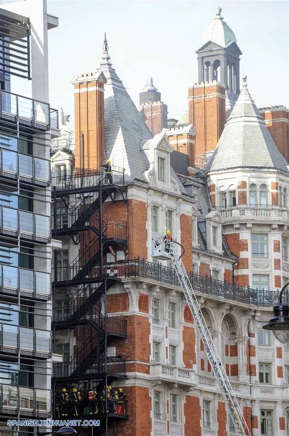 LONDRES, junio 6, 2018 (Xinhua) -- Bomberos y empleados de servicios de emergencias trabajan en la escena después de un incendio en el Mandarin Oriental Hotel, en Knightsbridge, Londres, Reino Unido, el 6 de junio de 2018. Un incendio de grandes dimensiones ocurrió el miércoles en el Mandarin Oriental Hotel en Knightsbridge, Londres, adonde fueron enviados 15 camiones de bomberos y cerca de 100 bomberos, confirmaron las autoridades locales, por el momento, se desconoce si hay víctimas. (Xinhua/Stephen Chung)
