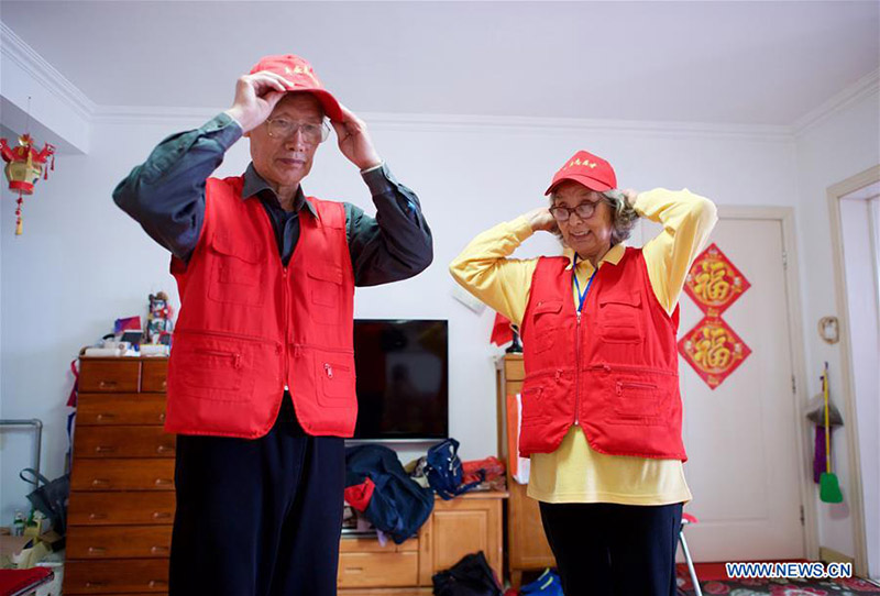Jiang Shifa y su esposa Lian Shifang se uniforman en su casa de Qingdao, provincia de Shandong, 5 de junio de 2018. Jiang, de 74 a?os de edad y su esposa Lian, de 72 a?os, después de jubilarse han trabajado como voluntarios durante más de diez a?os. A la veterana pareja le emociona el hecho de volver a ser voluntarios durante la Cumbre de la Organización de Cooperación de Shanghai, diez a?os después de participar en las tareas de los Juegos Olímpicos Beijing 2008. (Foto: Xinhua/ Jiang Kehong)