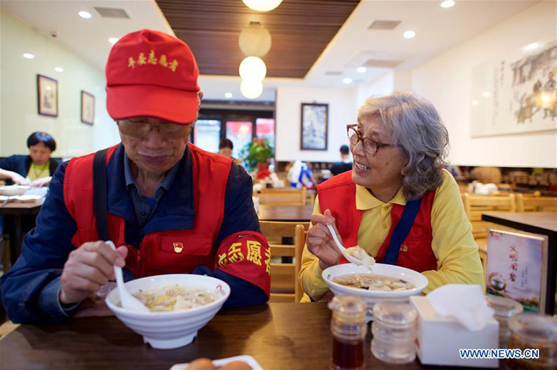 Jiang Shifa y su esposa Lian Shifang cenan en un restaurante de Qingdao, provincia de Shandong, 5 de junio de 2018. Jiang, de 74 a?os de edad y su esposa Lian, de 72 a?os, después de jubilarse han trabajado como voluntarios durante más de diez a?os. A la veterana pareja le emociona el hecho de volver a ser voluntarios durante la Cumbre de la Organización de Cooperación de Shanghai, diez a?os después de participar en las tareas de los Juegos Olímpicos Beijing 2008. (Foto: Xinhua/ Jiang Kehong)