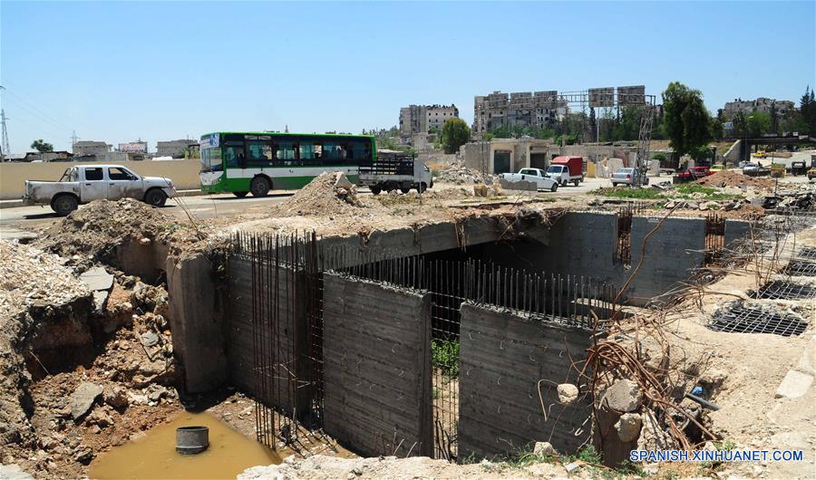 ALEPO, junio 9, 2018 (Xinhua) -- Imagen del 6 de junio de 2018 de una parte del Puente al-Haj bajo reconstrucción, en Alepo, Siria. Aproximadamente el 70 por ciento de las instalaciones de infraestructura de la ciudad de Alepo, en el norte de Siria, han sido reconstruidas desde que la ciudad fue completamente recuperada por el ejército sirio a finales de 2016. (Xinhua/Ammar Safarjalani)