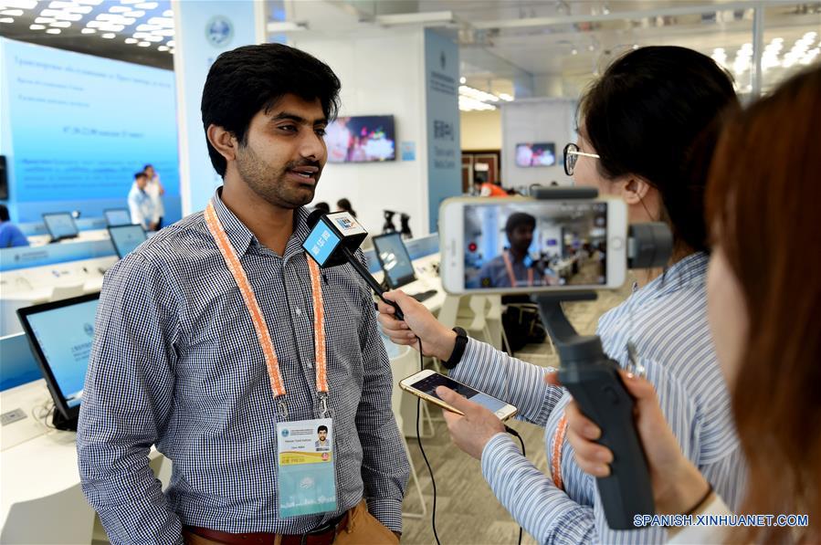 SHANDONG, junio 9, 2018 (Xinhua) -- Un periodista de Pakistán participa en una entrevista con la Agencia de Noticias Xinhua en el centro de medios de la XVIII Cumbre de la Organización de Cooperación de Shanghai (OCS), en Qingdao, provincia de Shandong, en el este de China, el 9 de junio de 2018. La XVIII Cumbre de la OCS es llevada a cabo del 9 al 10 de junio en Qingdao, y ha atraído a muchos periodistas nacionales y del extranjero a asistir para informar. (Xinhua/Li Ziheng)