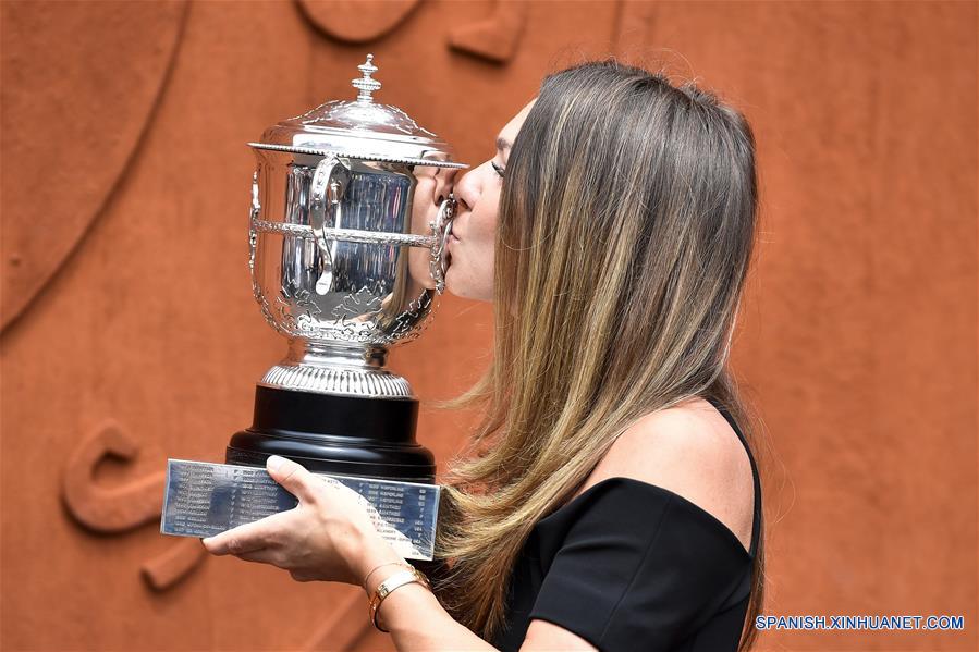 Simona Halep, de Rumania, la campeona de la categoría individual femenil del torneo de tenis Abierto de Francia 2018, besa el trofeo durante una sesión de fotos en París, Francia, el 10 de junio de 2018. (Xinhua/Chen Yichen)