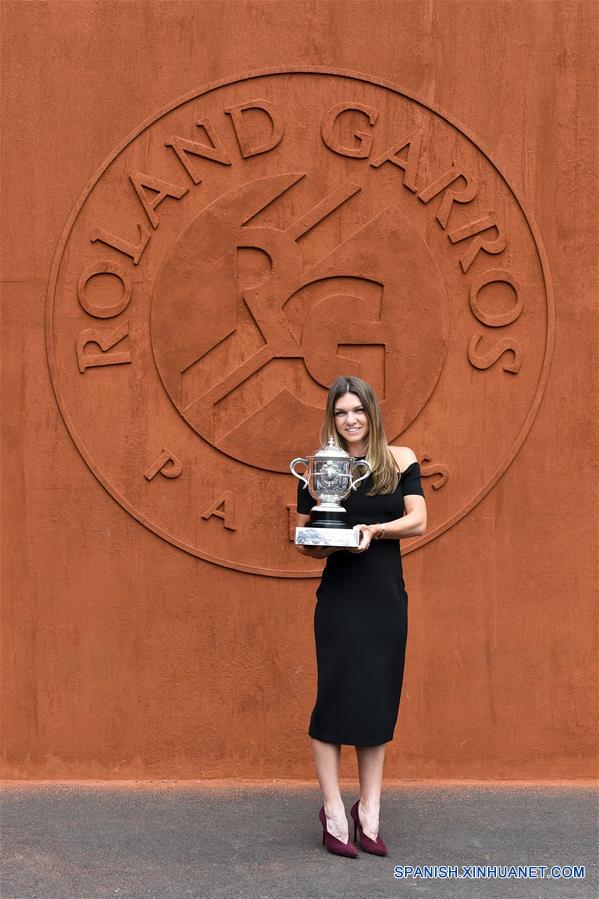 Simona Halep, de Rumania, la campeona de la categoría individual femenil del torneo de tenis Abierto de Francia 2018, posa con el trofeo durante una sesión de fotos en París, Francia, el 10 de junio de 2018. (Xinhua/Chen Yichen)