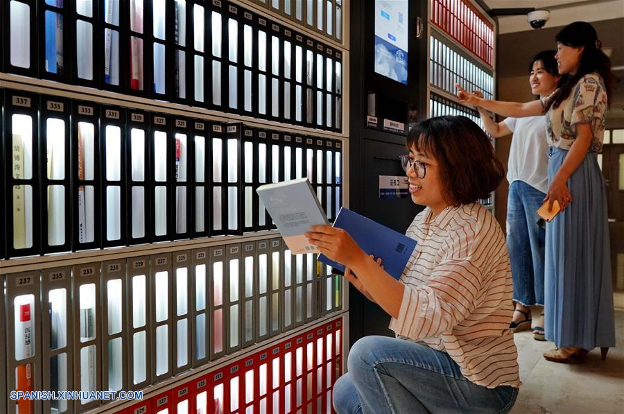 HEBEI, junio 11, 2018 (Xinhua) -- Lectores toman libros utilizando una biblioteca inteligente en el distrito de Xuanhua en Zhangjiakou, provincia de Hebei, en el norte de China, el 11 de junio de 2018. Más de 30 bibliotecas inteligentes fueron puestas en operación para el público en el distrito. (Xinhua/Yang Shiyao)