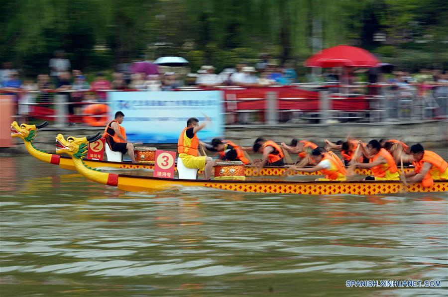 ANHUI, junio 11, 2018 (Xinhua) -- Personas participan en una competencia de botes dragón para celebrar el Festival Duanwu, en el condado de Wuhe, provincia de Anhui, en el este de China, el 11 de junio de 2018. (Xinhua/Zhou Jiandao)
