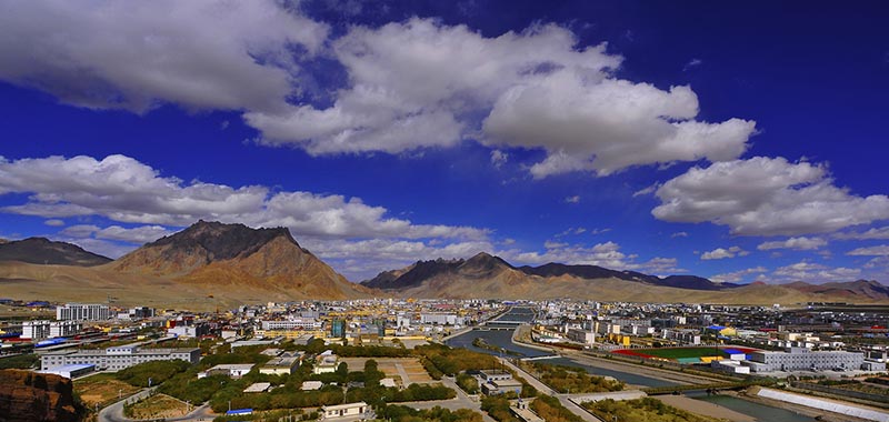 Una vista panorámica de la ciudad Shiquanhe, centro administrativo del condado Gar y la prefectura Ngari, Región Autónoma del Tíbet. [Foto: proporcionada]