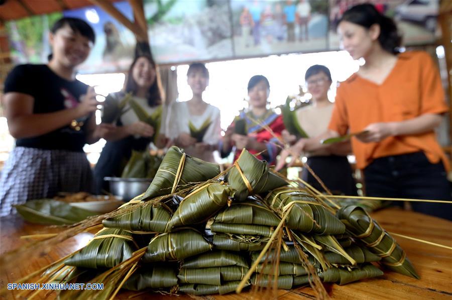 GUANGXI, junio 12, 2018 (Xinhua) -- Visitantes y residentes elaboran colorido Zongzi, bolas de masa hervida en forma de pirámide hechas de arroz glutinoso envuelto en hojas de bambú o de ca?a, para saludar al próximo Festival de Botes de Dragón, en el condado de Rong'an, capital de la Región Autónoma Zhuang de Guangxi, en el sur de China, el 12 de junio de 2018. (Xinhua/Tan Qinghe)