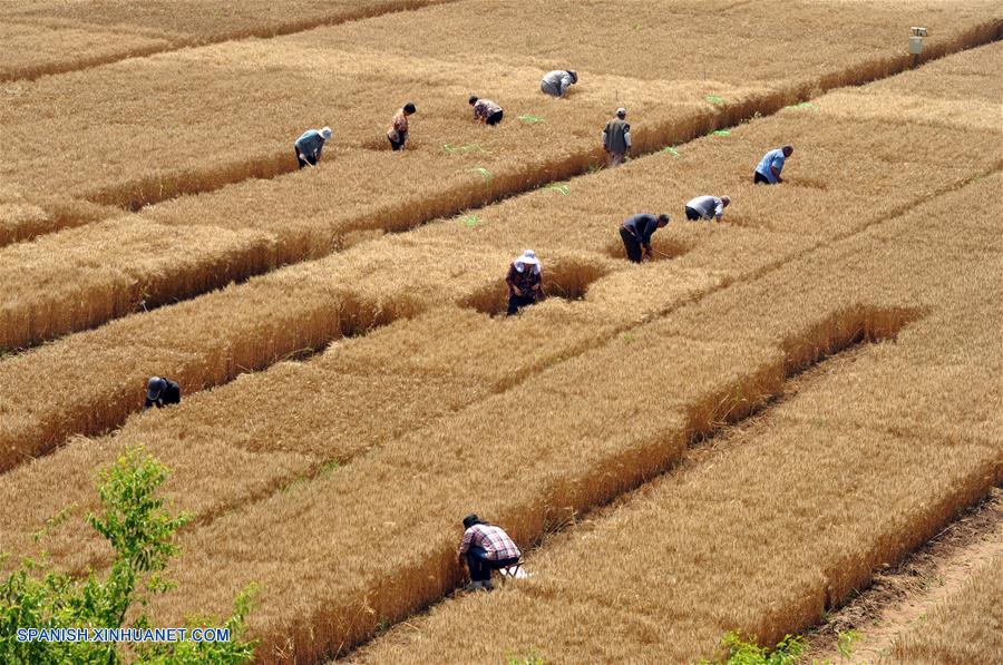 HEBEI, junio 12, 2018 (Xinhua) -- Empleados trabaja en el campo de prueba de la Estación Experimental Eco-Agrícola de Nanpi de la Academia de Ciencias de China (CAS, por sus siglas en inglés), en el condado de Nanpi, provincia de Hebei, en el norte de China, el 12 de junio de 2018. Los trabajadores de la estación experimental están ocupados en el muestreo y cálculo de un proyecto para impulsar la innovación agrícola y aumentar la producción de los cultivos. (Xinhua/Mu Yu)