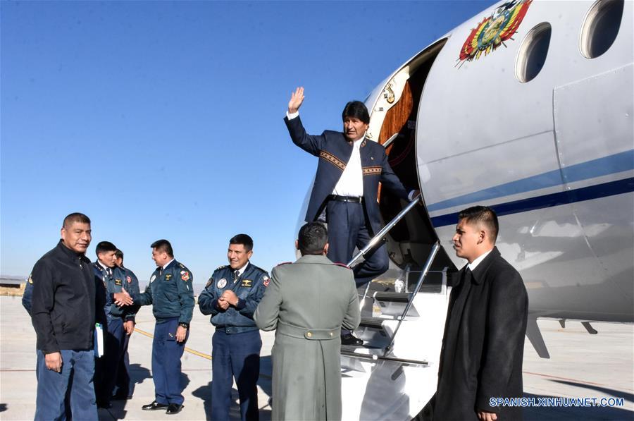 El presidente de Bolivia, Evo Morales (d-arriba) se despide al abordar el avión presidencial rumbo a Rusia, en el Hangar Presidencial, en La Paz, Bolivia, el 12 de junio de 2018. (Xinhua/R. Martínez Candia/ABI)