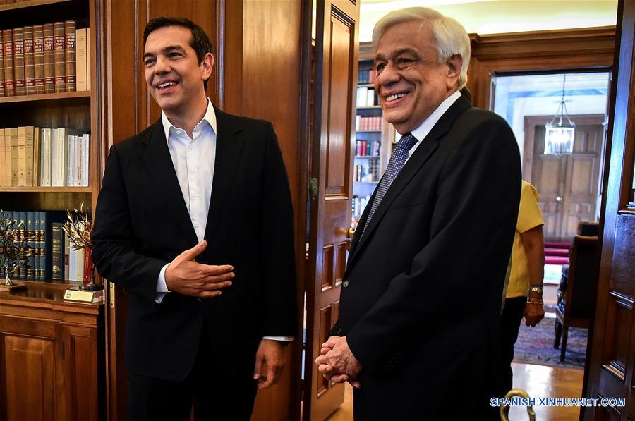 El primer ministro de Grecia, Alexis Tsipras (i), se reúne con el presidente de Grecia, Prokopis Pavlopoulos (d), para anunciar que Atenas y Skopie han alcanzado un acuerdo histórico acerca de su disputa, en Atenas, Grecia, el 12 de junio de 2018. República de Macedonia del Norte será el nuevo nombre de la Ex República Yugoslavia de Macedonia (ERYM), de conformidad con un histórico acuerdo logrado entre Grecia y el país vecino, dijo el martes en Atenas el primer ministro griego Alexis Tsipras. (Xinhua/Marios Lolos)