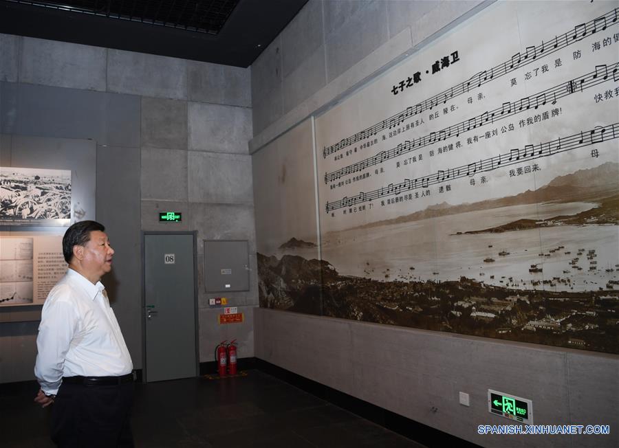 El presidente de China, Xi Jinping, también secretario general del Comité Central del Partido Comunista de China y presidente de la Comisión Militar Central, visita el Museo de la Guerra Sino-Japonesa de 1894-1895 en la Isla Liugong, durante una gira de inspección en Weihai, provincia de Shandong, en el este de China, el 12 de junio de 2018. (Xinhua/Li Xueren)