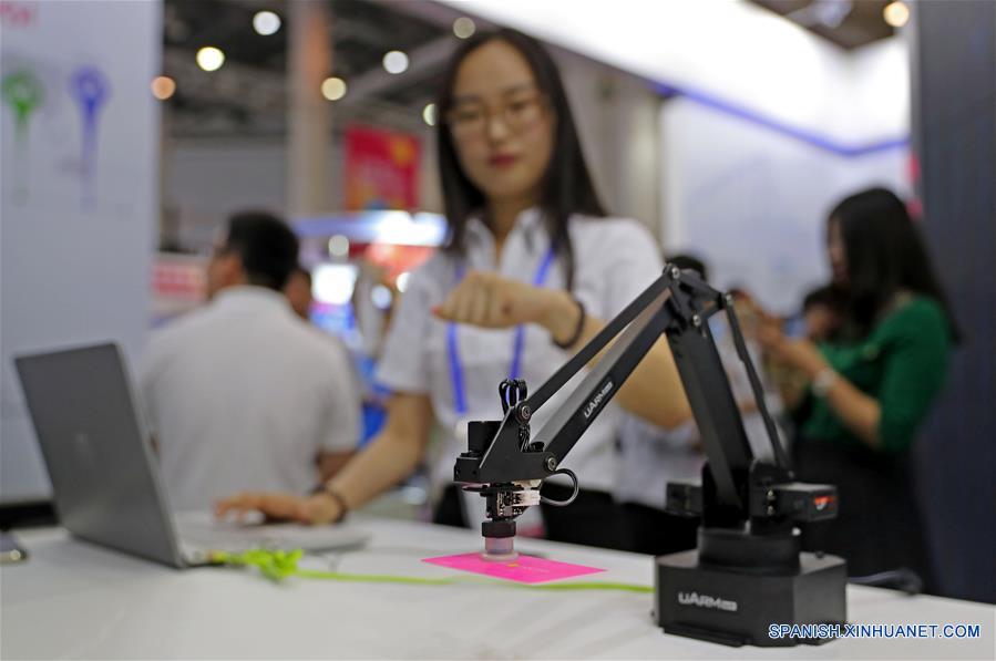 Una mujer manipula brazos mecánicos mediante tecnología 5G durante la 16 Feria Internacional de Servicios de Software e Información de China, en Dalian, provincia de Liaoning, en el noreste de China, el 12 de junio de 2018. La feria de servicios comenzó el martes en Dalian, con la participación de 750 expositores. (Xinhua/Yang Qing)