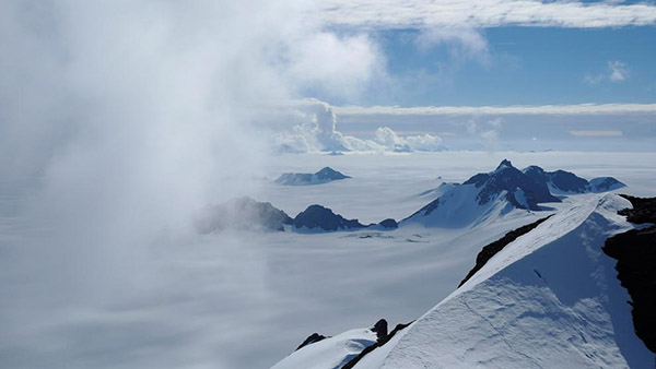 Fotografía facilitada de Nature de las nubes de verano se arremolinan alrededor de los Picos Staccato de la Isla Alexander, en la Península Antártica. (Hamish Pritchard / EFE)