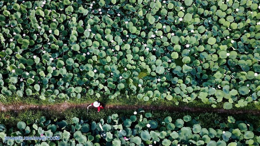 ANHUI, junio 14, 2018 (Xinhua) -- Una turista observa las flores de loto en la villa de Xihu en la ciudad de Tongling, provincia de Anhui, en el este de China, el 14 de junio de 2018. (Xinhua/Zhang Duan)