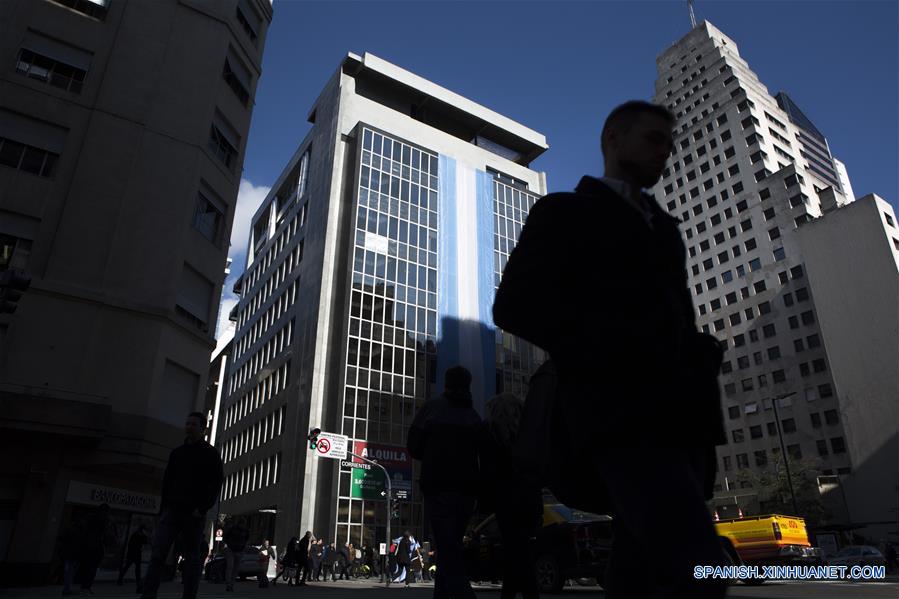 BUENOS AIRES, junio 14, 2018 (Xinhua) -- Personas caminan frente a un edificio que exhibe en su fachada una bandera, en el centro financiero de Buenos Aires, capital de Argentina, el 14 de junio de 2018. El dólar estadounidense en Argentina escaló el jueves 1.70 pesos argentinos por unidad respecto al pasado miércoles y se cotizó al cierre de la jornada del jueves en 28.20 pesos argentinos para el mercado minorista de venta al público, según el marcaje del oficial Banco Nación. (Xinhua/Martín Zabala)
