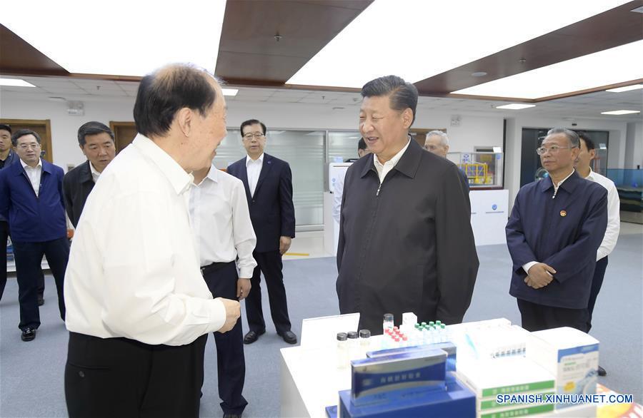 SHANDONG, junio 12, 2018 (Xinhua) -- El presidente de China, Xi Jinping, también secretario general del Comité Central del Partido Comunista de China y presidente de la Comisión Militar Central, conversa con el académico de la Academia de Ingeniería de China, Guan Huashi, en el Laboratorio Nacional Piloto de Ciencia y Tecnología Marina, durante una gira de inspección en Qingdao, provincia de Shandong, en el este de China, el 12 de junio de 2018. (Xinhua/Li Xueren)