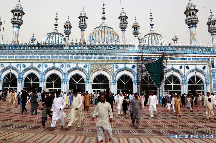 RAWALPINDI, junio 16, 2018 (Xinhua) -- Musulmanes pakistaníes se retiran después de ofrecer oraciones del Eid al-Fitr en la Mezquita Jamia, en Rawalpindi, Pakistán, el 16 de junio de 2018. (Xinhua/Ahmad Kamal)