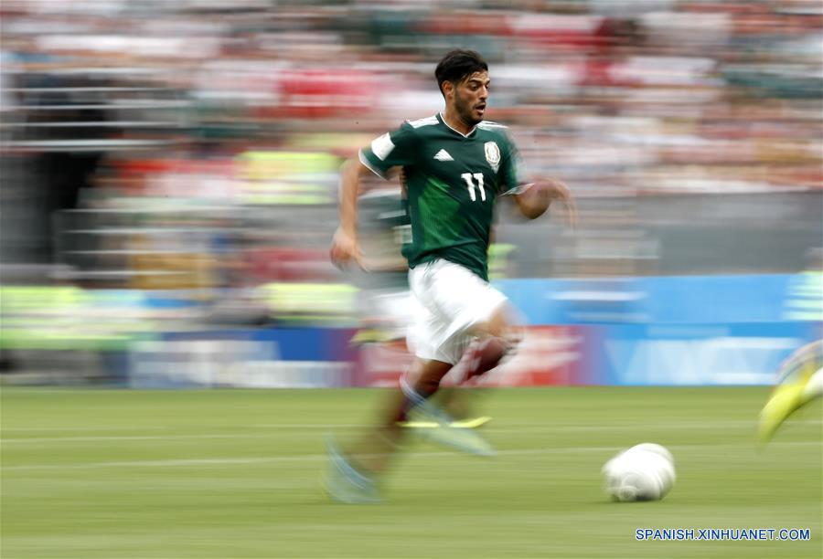El jugador Carlos Vela, de México, controla el balón durante el partido del Grupo F de la Copa Mundial de la FIFA Rusia 2018, ante Alemania, en Moscú, Rusia, el 17 de junio de 2018. (Xinhua/Cao Can)