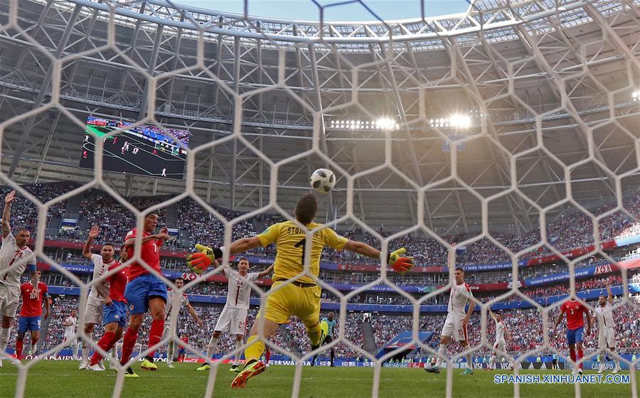 El guardameta Vladimir Stojkovic, de Serbia, protege la portería durante el partido del Grupo E de la Copa Mundial de la FIFA Rusia 2018, ante Costa Rica, en Samara, Rusia, el 17 de junio de 2018. (Xinhua/Fei Maohua)