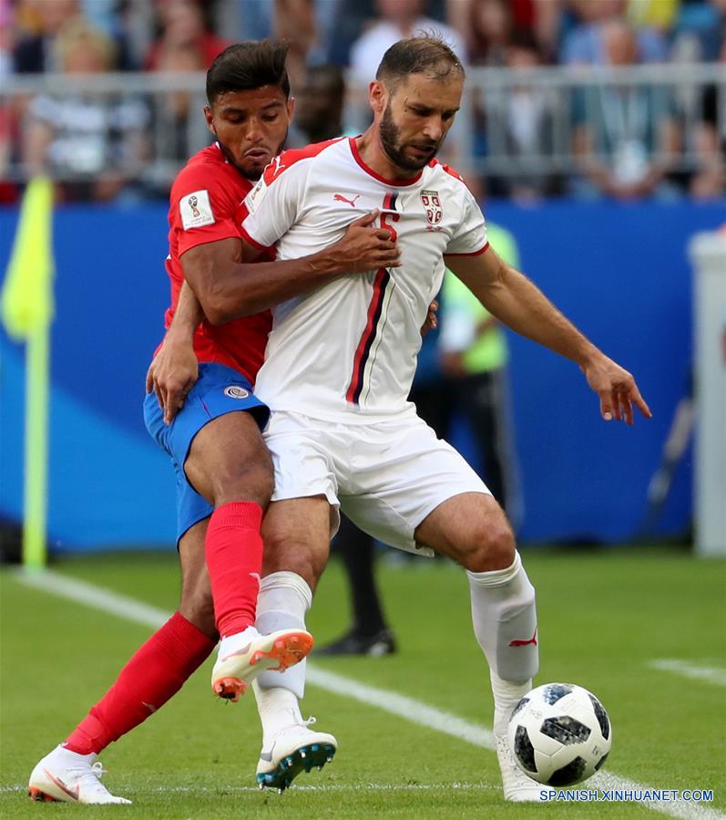 El jugador Johan Venegas (i), de Costa Rica, disputa el balón con Branislav Ivanovic (d), de Serbia, durante el partido del Grupo E de la Copa Mundial de la FIFA Rusia 2018, en Samara, Rusia, el 17 de junio de 2018. (Xinhua/Ye Pingfan)