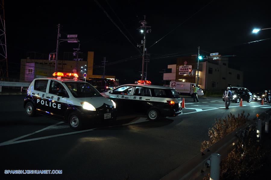 Oficiales de policía desvían a vehículos en un camino da?ado en Osaka, Japón, el 18 de junio de 2018. (Xinhua/Ma Ping)