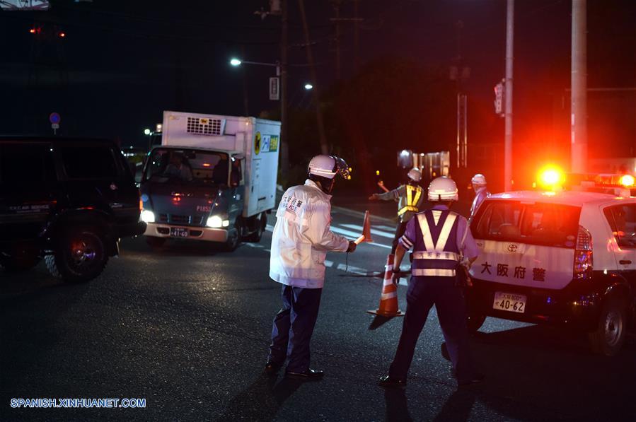 Oficiales de policía desvían a vehículos en un camino da?ado en Osaka, Japón, el 18 de junio de 2018. (Xinhua/Ma Ping)