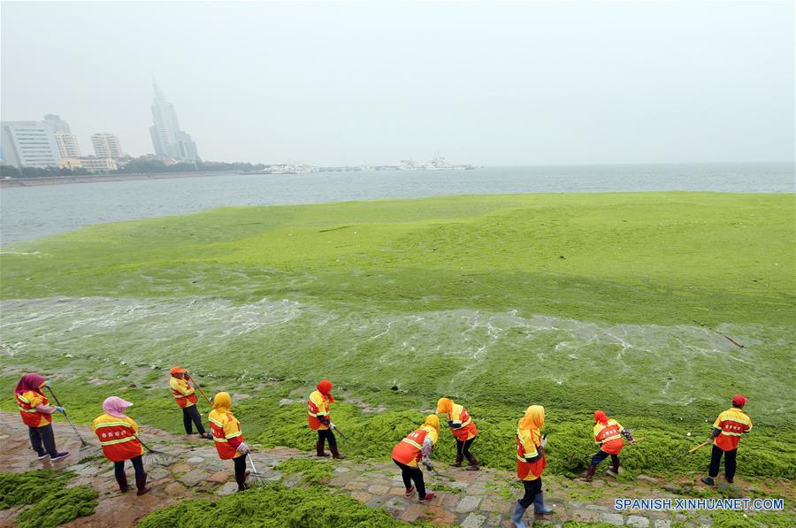 Trabajadores quitan lechugas marinas esparcidas a lo largo de la línea costera en la bahía de Tuandao, en Qingdao, provincia de Shandong, en el este de China, el 18 de junio de 2018. Como parte de una de las especies de alga verde, la lechuga marina puede causar preocupaciones de tipo ambiental cuando crece excesivamente. (Xinhua/Huang Jiexian)