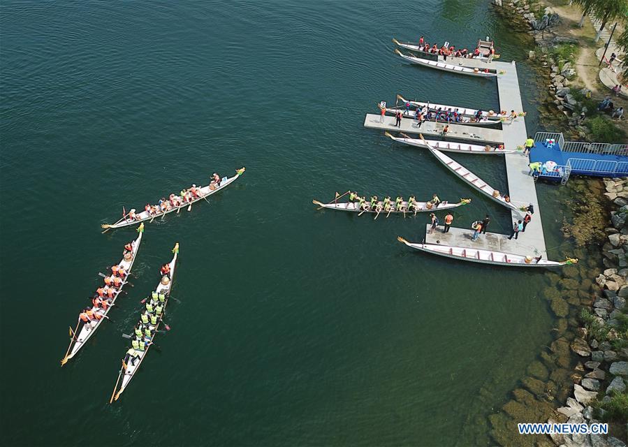 Lianyungang, 19/06/2018 (El Pueblo en Línea) -Una competencia de remo alegórica al Festival del Bote del Dragón forma parte de las celebraciones en el condado Donghai, de la ciudad Lianyungang, provincia de Jiangsu. El encanto vacacional del Festival del Bote del Dragón se disfrutó por toda China. 17 de junio del 2018. (Foto: Xinhua/ Geng Yuhe)