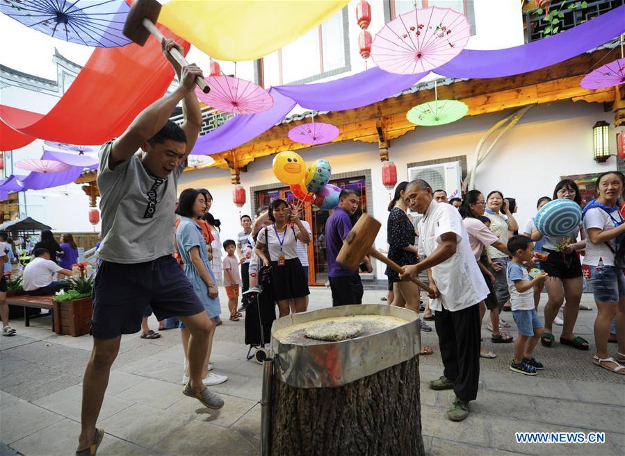 Yongzhou, 19/06/2018 (El Pueblo en Línea) -Vendedores preparan aperitivos típicos en la antigua ciudad de Lingling en Yongzhou, provincia de Hunan, China central, el 17 de junio de 2018. La antigua ciudad de Lingling, que incluye la antigua residencia de Liu Zongyuan y estudios donde mostrar el patrimonio cultural inmaterial, abrió al público el lunes. (Xinhua / Liu Yongzhen)