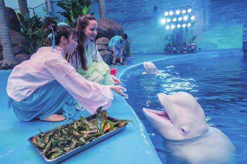 Chengdu, 19/06/2018 (El Pueblo en Línea) -Los trabajadores del Parque Marino Haichang dan un zongzi hecho de pescado a una ballena blanca para celebrar el tradicional Festival del Bote de Dragón de China, en Chengdu, provincia de Sichuan, suroeste de China, el lunes. Zongzi, una bola de masa hervida en forma de pirámide, se hace generalmente de arroz glutinoso envuelto en bambú u hojas de ca?a. Foto: VCG