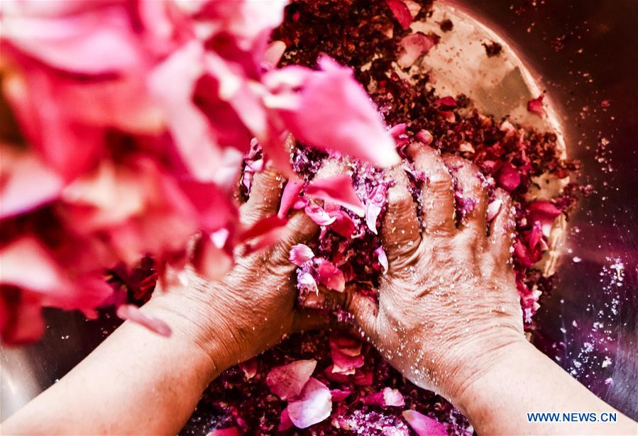 Tajinisa prepara salsa rosa. Los aldeanos de Hotan son buenos elaborando la famosa salsa rosa, un producto que les genera importantes ingresos. Aldea Hotan, Región Autónoma de Xinjiang Uygur, 6 de junio del 2018 (Foto: Xinhua/ Zhao Ge)